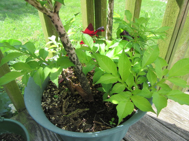 I put #1 in an old milk crate to keep it from blowing over again. The bricks up against the pot may not work anymore…