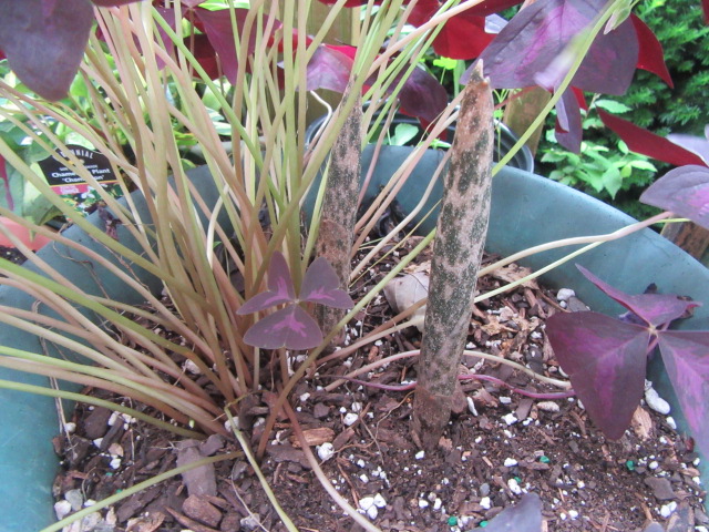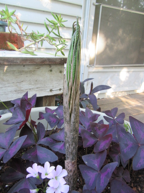 The Oxalis started coming up soon after I moved the pots outside but there was no sign of the Amorphophallus. The rhizome, or whatever it is, in the center of the pot is the same as it was all last summer. So, after being patient long enough…