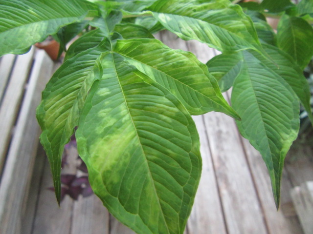 Looking back at all the photos from the beginning, I can see that #2 has always been somewhat behind #1 but I had no idea it could have been because it had a virus. I didn’t know until I sent photos to a friend who suggested it was a virus. I had already looked online and did a search as to why my Amorphophallus came up with variegated leaves. The results led to an Amorphophallus forum where someone had inquired about the same thing. The possibility was a virus… Then my friend suggested Konjac Mosaic Virus or Dasheen Mosaic Virus. He said to post photos on the Facebook group called Amorphophallus. The suggestion there was the same…