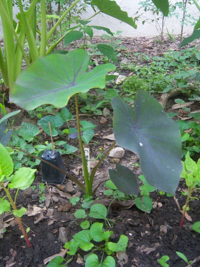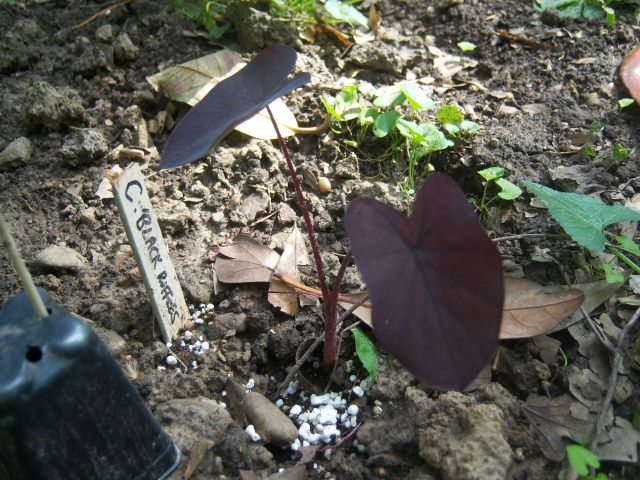 Colocasia esculenta ‘Black Ruffles’ as a starter plant on 4-15-12, #86-25.