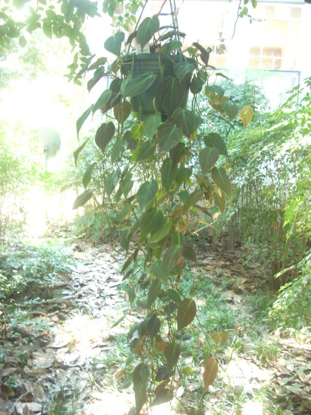 As soon as temperatures allowed, I would take the potted plant outside. I always hung the two Philodendron hederaceum in the Ligustrum tree in the backyard. The green-leaved form grew much faster and fuller than the other and I had to keep hanging it higher in the tree.