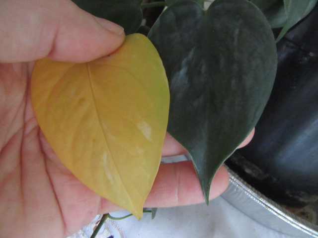 The yellow color of the Epipremnum aureum leaf is not what they normally look like. It was a leaf that was dying and needed to be removed. The photo shows the difference between the two plants.