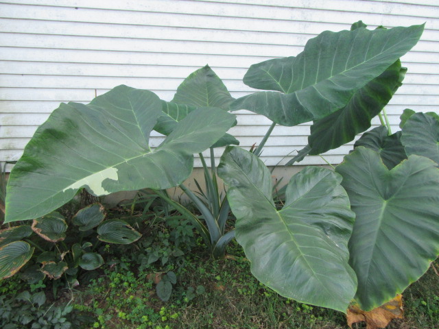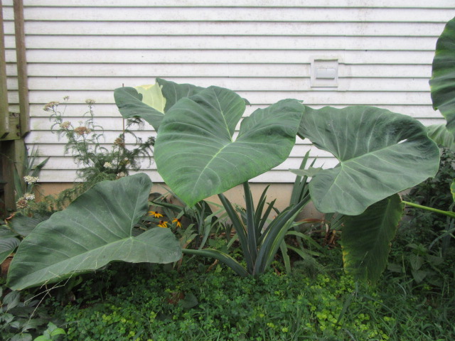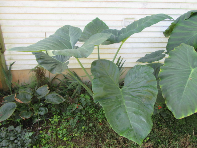 It is very interesting how I came to have this Xanthosoma robustum OR X. sagittifolium as a companion. When my sister came down from the city to go plant shopping at the local Amish greenhouses in the spring of 2017 I found a Colocasia gigantea ‘Thailand Giant’. I brought it home and it did very well. I stored the rhizome overwinter in the basement. It did fine until just about time to plant the Colocasia the next spring when I noticed it had rotted. So, when my sister came again in 2018, when we went plant shopping, I checked with the same greenhouse and he said he got his order in too late and the supplier had run out of Colocasia gigantea ‘Thailand Giant’. So, I checked several reliable sources online but didn’t want to pay some of their prices. I found a listing on Ebay for rhizomes… Well, the name is Leucocasia gigantea now.
