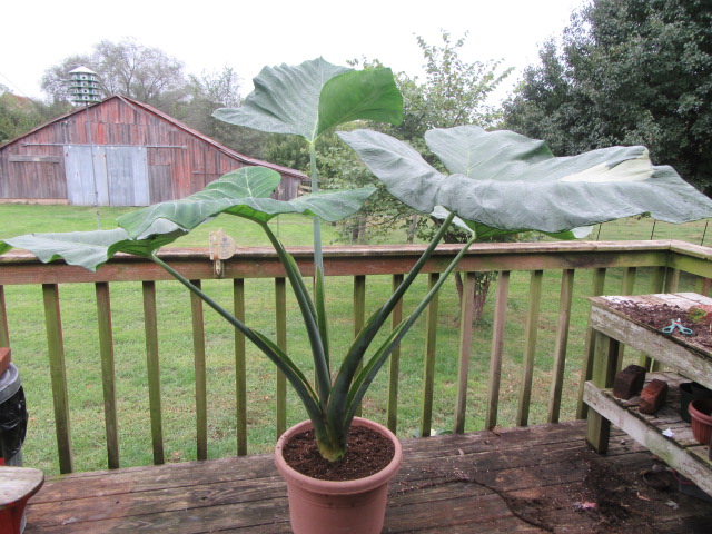 Xanthosoma robustum OR X. sagittifolium in a pot for winter on 10-14-18, #521-3.