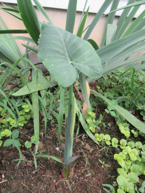 The arrival of the new Leucocasia gigantea ‘Thailand Giant’ bulb on 5-22-18, #447-9.