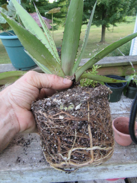 On July 12 I decided the Agave lophantha needed to be in a larger pot… I had moved the plant table from behind the shed to the front porch and the potting table to the back porch.