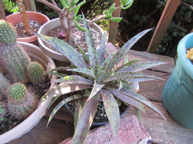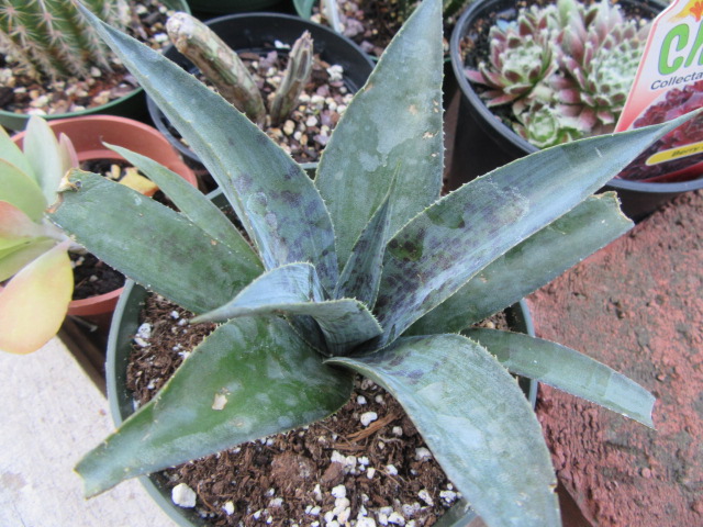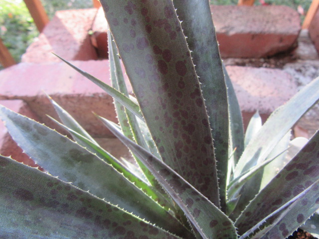 SINCE Mangavé ‘Bloodspot’ = (Agave macroacantha x Manfreda. maculosa) – (Gray-green lvs maroon speckled)