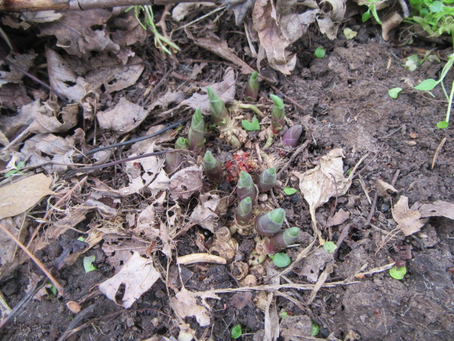 Spring was in the air when the above photo was taken on March 30 and the Hosta have been “working on it”. Most of them have been poking out of the ground for a while and now are beginning to turn green. They are a bit slow sometimes when cool temps linger, but as soon as it gets warm enough they will start growing better. It seems like they are waiting for the perfect opportunity.