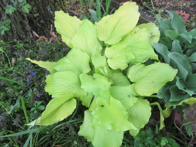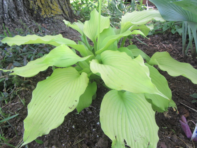 I had dug a spot next to the old goldfish pool and had already moved the Hosta ‘Krossa Regal’ there. This was a great spot for the new Hosta ‘Dancing Queen’. One thing for sure is that it really brightened up the whole area. It is so bright you can see it from far away. Leaves emerge bright yellow and turn pale yellow to green as the season progresses, especially if they are in more shade. This cultivar needs a shadier area, though, as I don’t believe it is that sun tolerant.