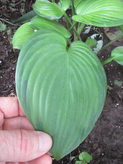 The leaves of Hosta ‘Guacamole are a nice medium green with a narrow irregular darker green margin. The largest leaf is 5 1/4″ wide x 7″ long. The leaves change color somewhat during the summer.