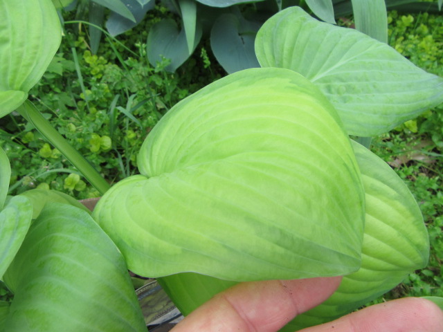 Hosta ‘Guacamole’ leaves can get up to 11″ long x 8″ wide.