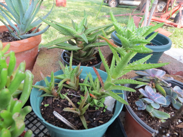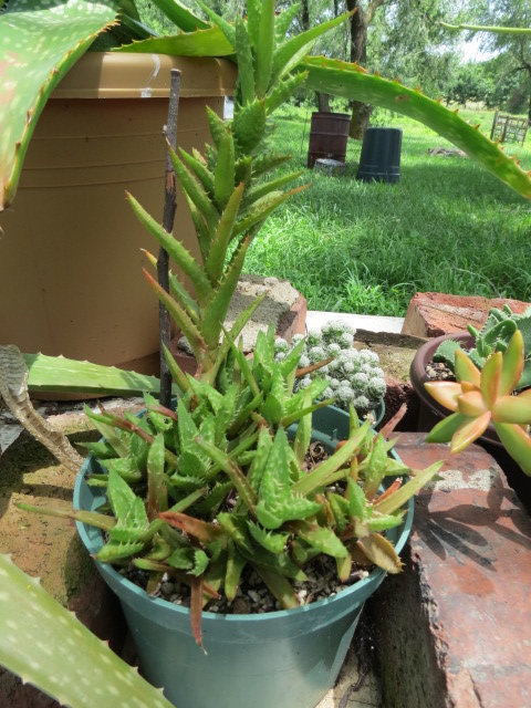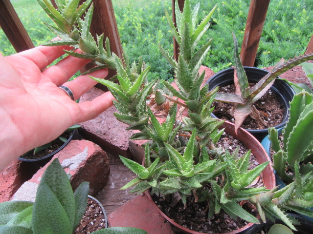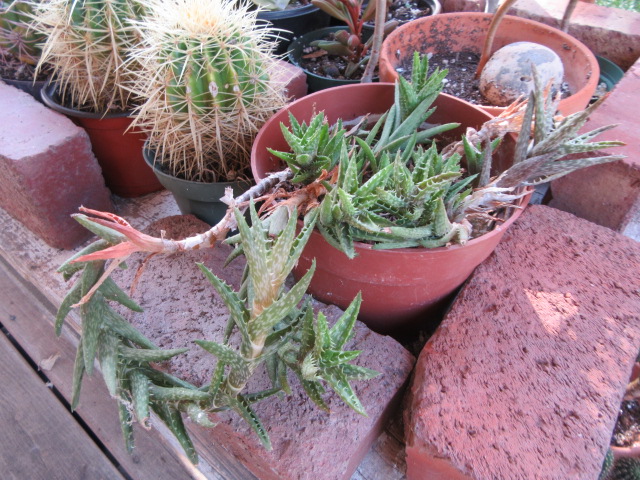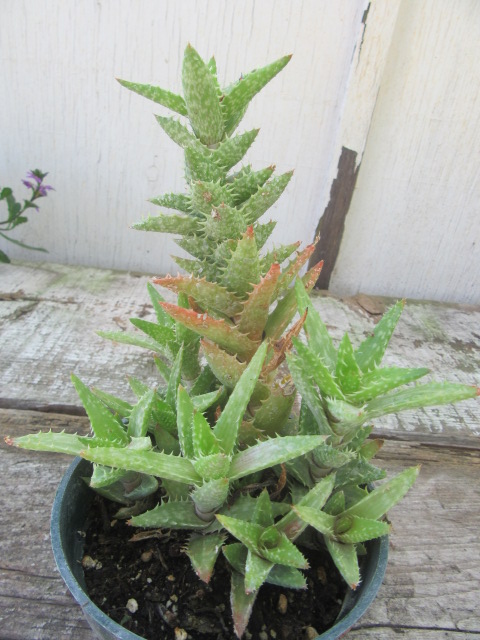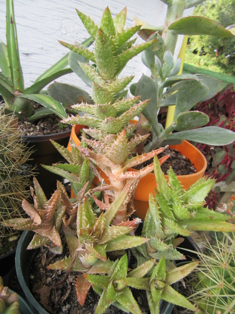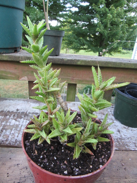 Well, the Aloe juvenna is definitely looking much better than last year. Its leaves were brownish looking most of the winter while inside and it really perked up over the summer. Its longest stem is around 16″ long and the tallest plant in the pot is 5 1/2″ tall. I need to remove the dead leaves on its longer stems… What do you think?