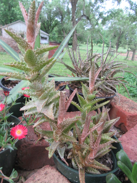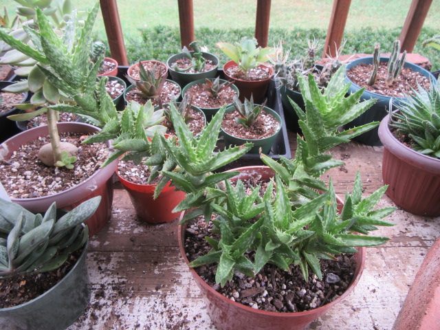 The Aloe juvenna and friends are doing well on the front once again for the summer. The cactus are on the back porch while most of the succulents are on the front porch. The back porch receives full sun while the plants on the front porch are in light to part shade. Most of the succulents would do OK on the back porch but space is somewhat limited.