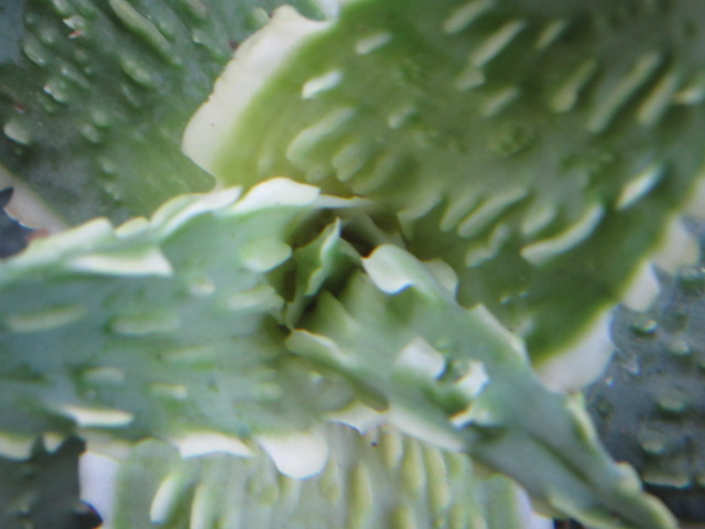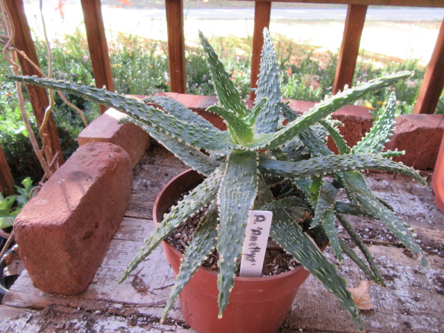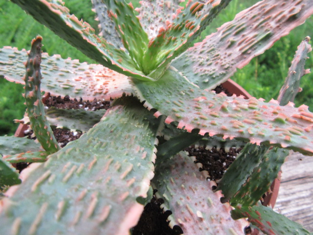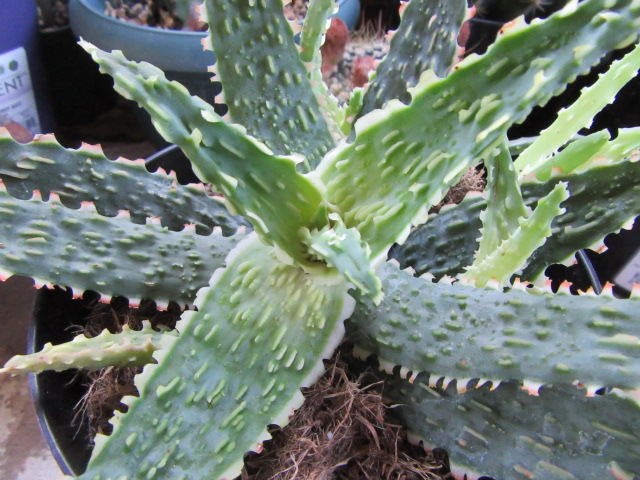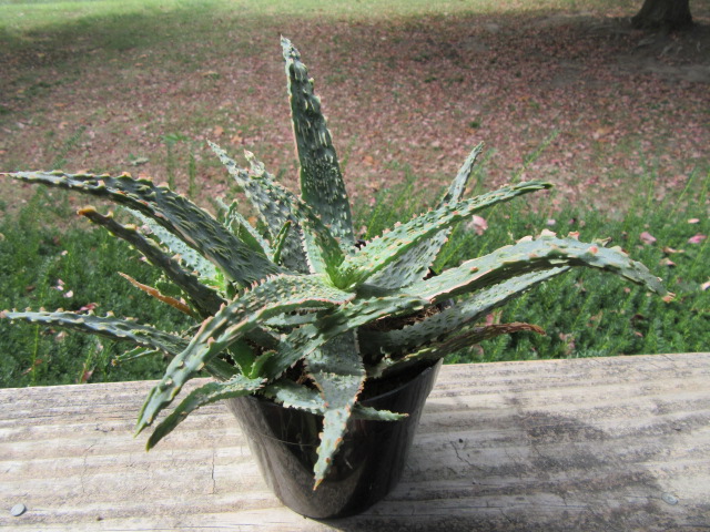 Aloe and their cousins are considered a summer dormant/winter growing species but for me, they seem to grow pretty much year-round. I read where Aloe hybrids don’t go dormant and whether the species are summer or winter dormant depends on where they are native. Personally, I think most Aloe will grow year-round if given the opportunity but I am no expert. For me, I think they do most of their growing while outside from May through mid-October, but most show no sign of being dormant while inside for the winter. Their growth does slow down while inside over the winter and I pretty much withhold their watering to a little once a month if necessary. Normally, I keep the succulents in a cool bedroom in a south-facing window over the winter. However, I had to make a change and this Aloe is in my bedroom over the winter. Soon it will go on the front porch for the summer.