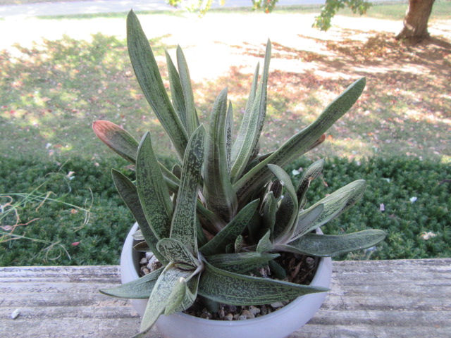 Some websites say this plant likes full sun, but I am not so sure about that. In its natural habitat, Gasteria grows in light shade to shade. More light will make them have a reddish color. You just have to experiment but never take your plants from being inside all winter and put them in direct sun right off the bat. They need to get used to more light, so gradually introduce them to it.