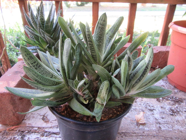 I had to bring the potted plants inside for the winter on October 15 because an “F” was in the forecast. I took photos and measurements as usual. The Gasteria ‘Little Warty’ did very well over the summer and measured 5 1/4″ tall x 5 1/4″ wide. I forgot to measure the offset I put in its own pot but it is also doing well.