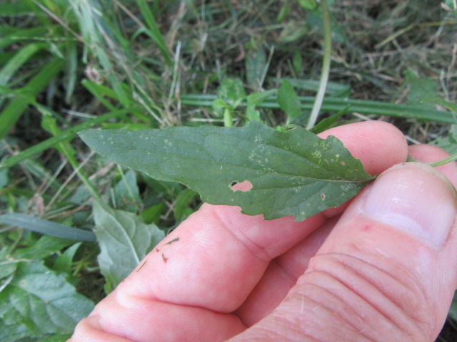 This plant has several types of leaves on the same plant. Leaves are mainly opposite while upper leaves may be alternate. Leaves are petiolate, narrowly lanceolate to broadly ovate, and bluntly or sharply pointed. Margins of leaves are finely to coarsely and bluntly to sharply toothed. Leaf surfaces are smooth (glabrous) or covered with short, soft hairs (pubescent) along the veins.