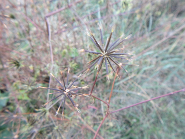 The seeds, called achenes, spread out like pins in a pincushion. The long narrow seeds are 4-angled, somewhat square in cross section, with 2-4 awns at the tip (which are persistent awns from the female flower) with downward pointing barbs.