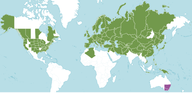The above distribution map for Bidens tripartita is from Plants of the World Online. Areas in green are where the species is native and green where it has been introduced. The map on the USDA Plants Database for the United States and Canada is somewhat different for Canada.
