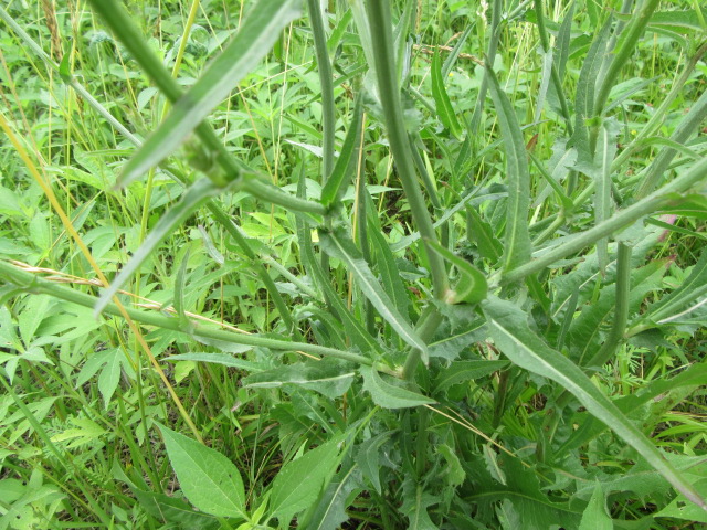 Most of the stem leaves clasp the stems and are often auriculate (lower lobes that clasp the stem). The upper surface is usually glabrous (no hairs) while the undersurface has fine short hairs (pubescent), especially along the midribs.