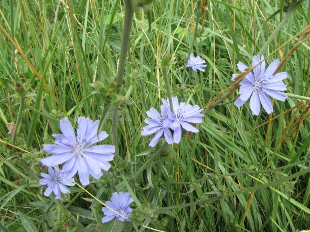 Have you ever wondered what those blue flowers are growing along highways and backroads? Well, folks, they are likely Cichorium intybus, commonly known as Chicory, Road Aster, Blue Daisy, Blue Dandelion, Blue Sailors, Blue Weed, Bunk, Coffeeweed, Cornflower, Hendibeh, Horseweed, Ragged Sailors, Succory, Blue Bachelor’s Buttons, Wild Endive, and possibly others. You may recognize a few of those names that are associated with other species as well.