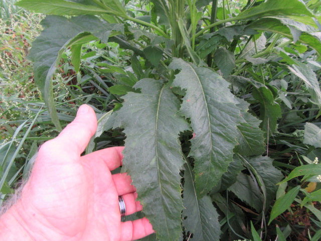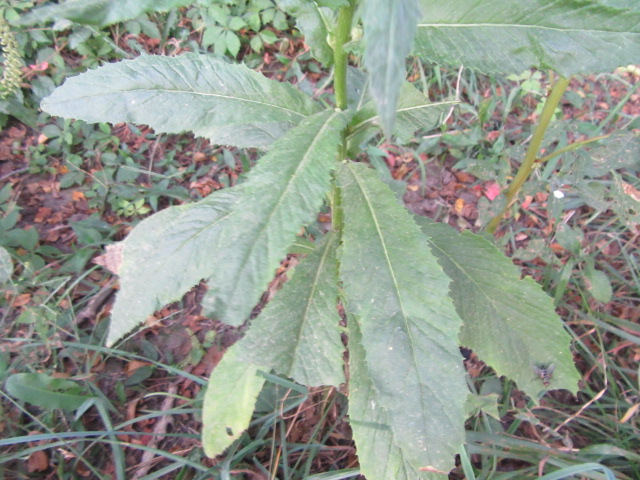 Leaves grow in an alternate manner and are up to 8” long and 3” across, becoming smaller as they ascend the stem. The leaves are elliptic, narrowly ovate, lanceolate, to oblanceolate, and taper to a sharply pointed tip. The leaves have either short petioles (leaf stems), are sessile (no petioles), or clasp the stem depending on their location. The margins are irregularly coarsely toothed, sometimes shallowly pinnately lobed.
