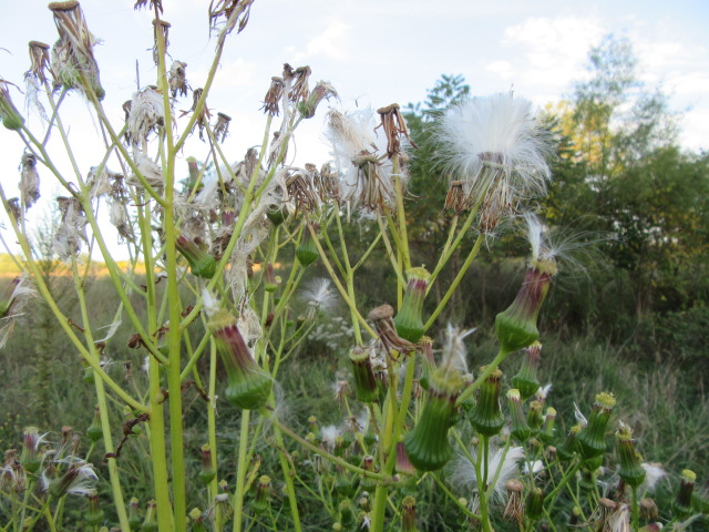 Once flowering is completed, the florets are replaced by short (2-3 mm) light brown achenes with white hair. The persistent involucre bracts open up and hang downward so the wind can carry the seeds away.