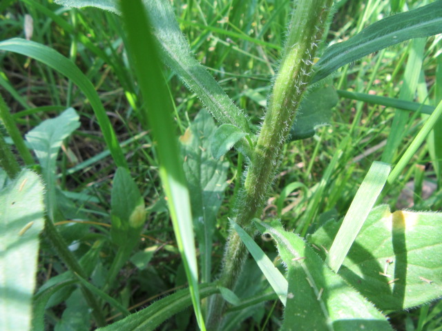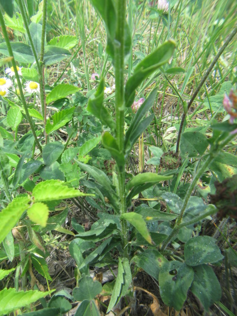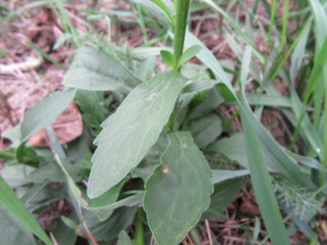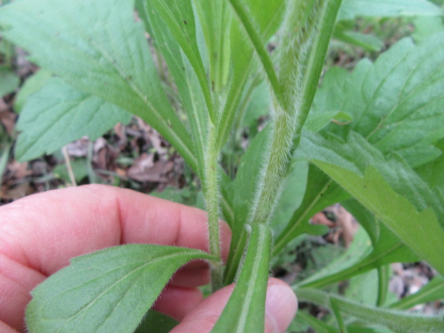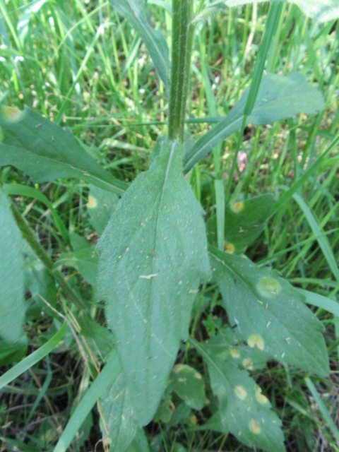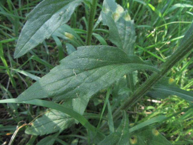 The alternate stem leaves are about an 1 to 4” long. The lower stem leaves have short petioles, while the middle and upper leaves have no petioles (sessile). Middle to upper leaves are oblanceolate, elliptic, or lanceolate in shape, taper toward the base, some slightly clasping the stem, and have pointed tips. The surfaces of the leaves are fairly smooth to moderately hairy and the margins have teeth from the midpoint to the tip.