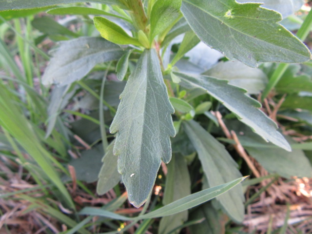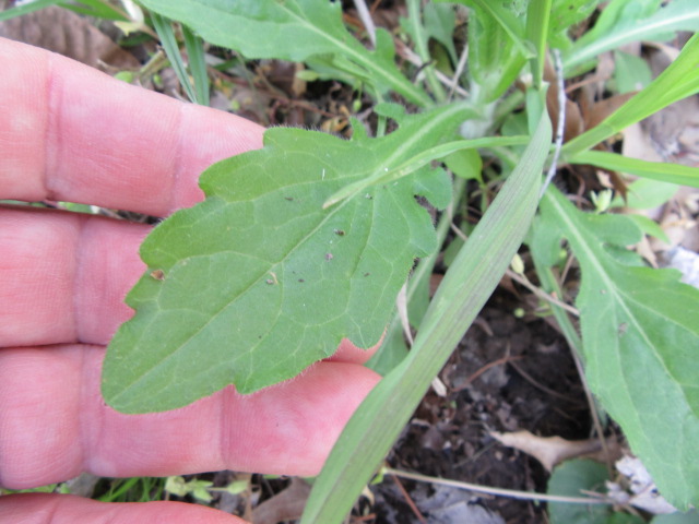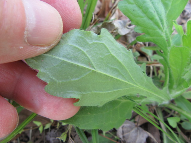 Basal leaves grow from about 2 to 6” long on fairly long petioles (leaf stems) and are broadly oblanceolate to broadly obovate in shape tapering toward the base. The margins are coarsely to sharply toothed and the surfaces are sparsely to moderately hairy (pubescent) with short, fairly stiff, curved hairs.