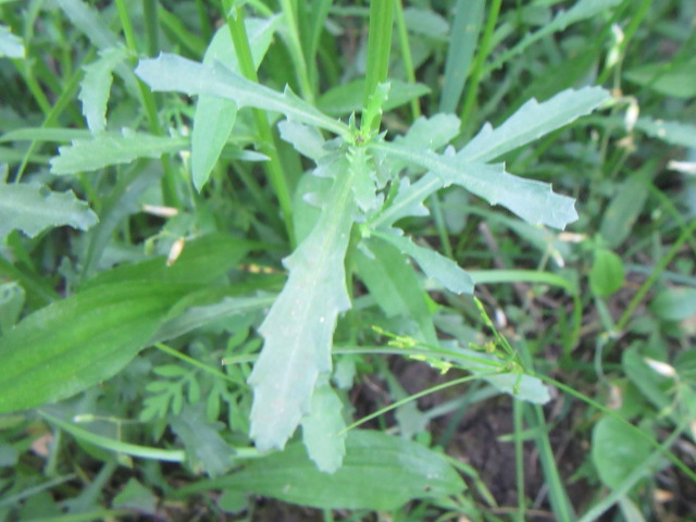 Lower and basal leaves have kind of long petioles (stem between the main stem and base of the leaf) while the upper leaves are sessile (no petioles) and may even tend to clasp the main stem. The leaves are deeply serrated, sometimes cut nearly to the midrib and are hairless.
