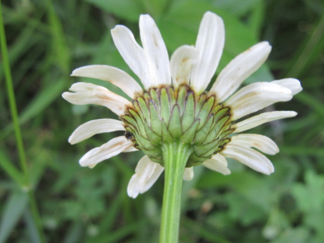 The flowers are usually 1 1/4-2″ in diameter and consists of 15-35 white ray florets. The petals have toothed ends. The center of the flower consists of who knows how many disc flowers which, of course, are yellow. The yellow corollas are 5-lobed. Check out Missouri Plants and you can see a close-up of the disc.