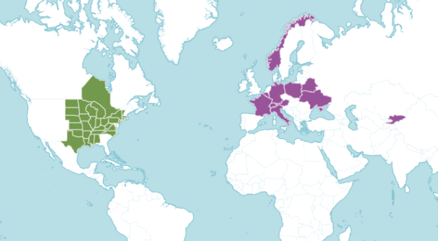The above distribution map for Silphium perfoliatum is from Plants of the World Online. Areas in green are where the species is native and purple is where it has been introduced. The map on the USDA Plants Database is a little different.