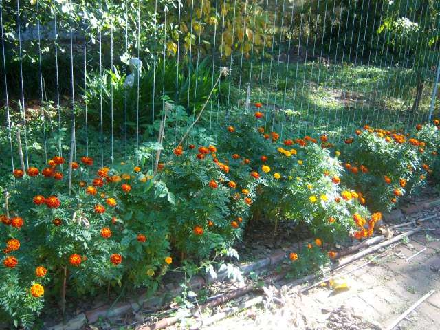 Marigolds are great companion plants because they deter some insects. They are great to plant with tomatoes, peppers, eggplant, tobacco, and potatoes for this reason. Some species are said to aid in the removal of nematodes. They are not good to plant with legumes, though, because their roots produce antibacterial thiophenes.