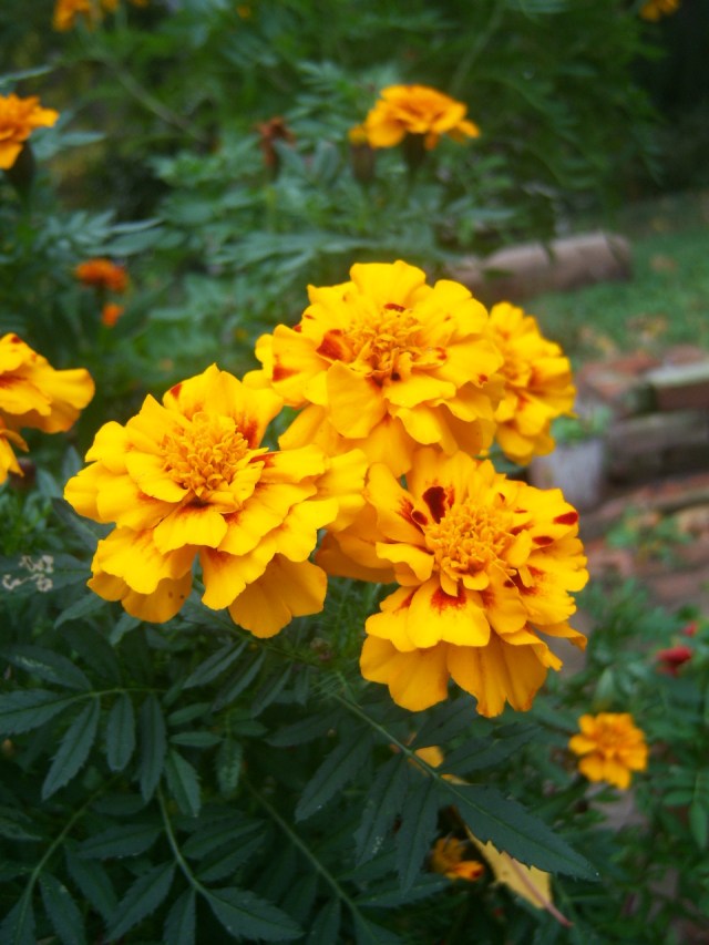 I started the seeds in the sunroom then transplanted them here and there in the backyard. I transplanted the Marigold ‘Petite’ along the front of the border and the ‘French Dwarf Double” behind them. The ‘Petite’ were supposed to grow to only around 8″ tall… That did not happen. They grew to the same height as the ‘French Dwarf Double.’