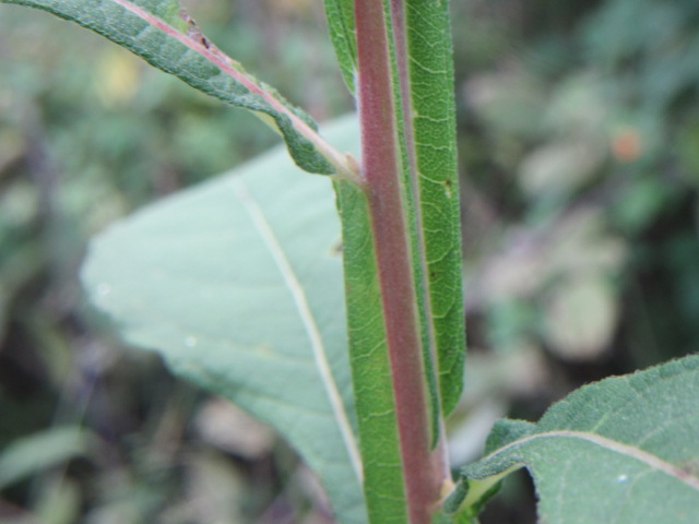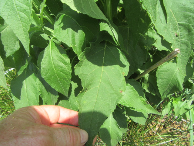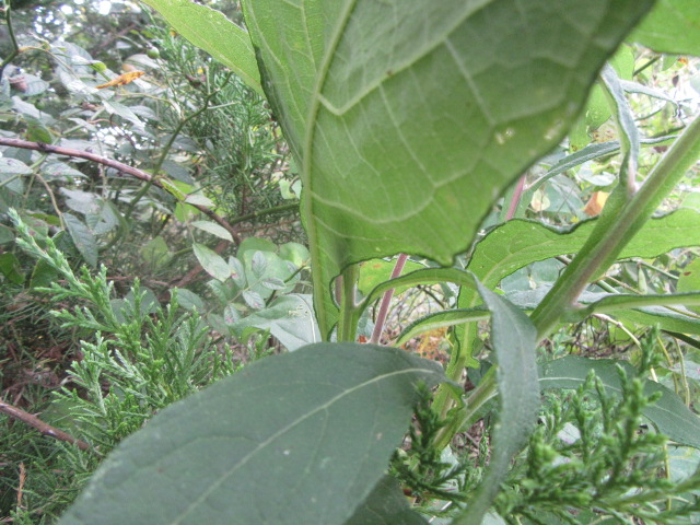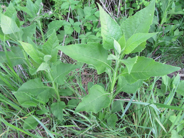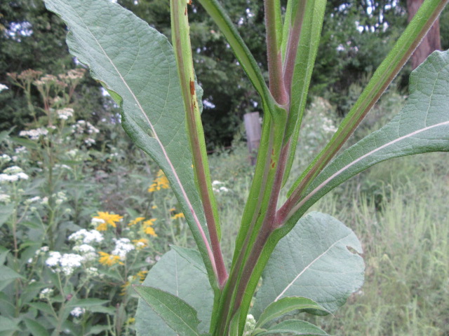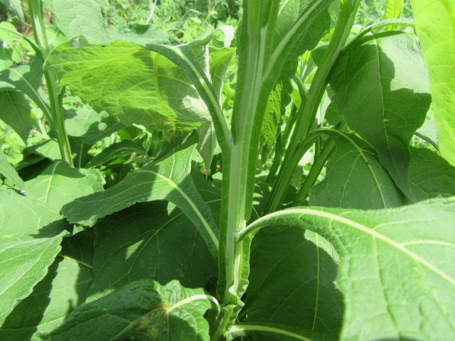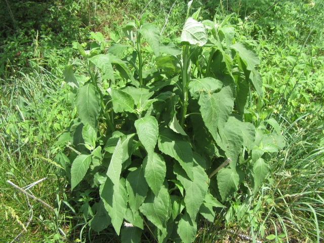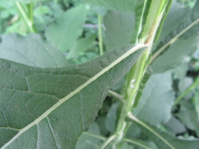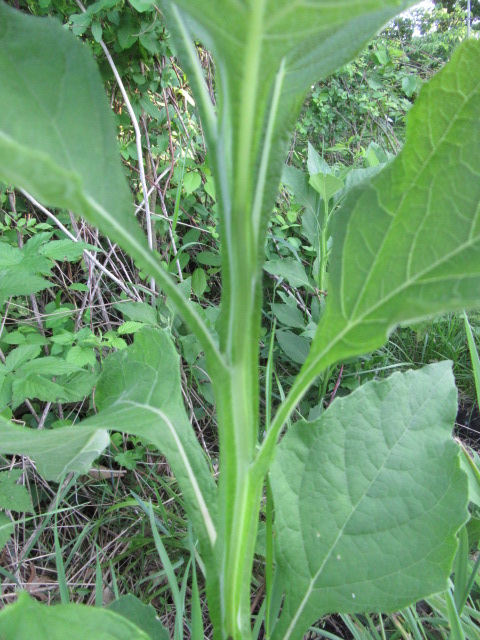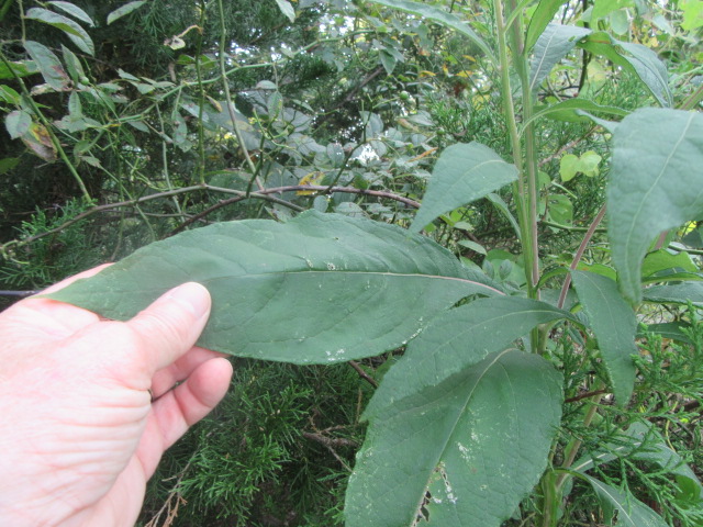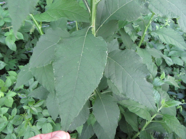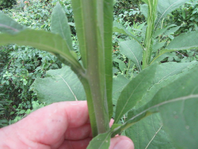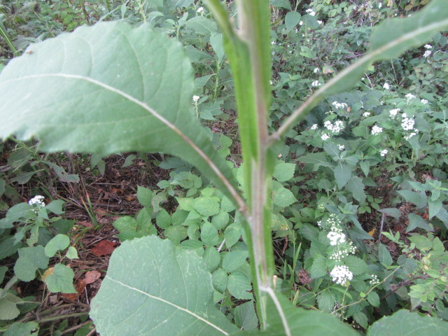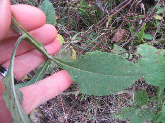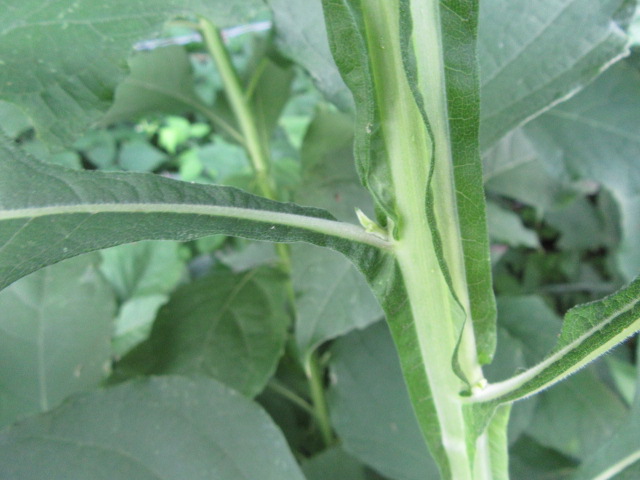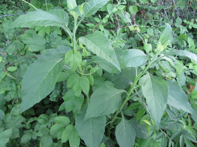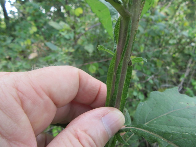 The leaves grow in an alternate pattern along the stems and are said to be narrowly elliptic or lanceolate-elliptic to ovate. In other words, they are broad and long, tapering to a point. The base of the leaves narrow to become winged petioles that extend down to the stem. The largest leaves can be around 7-10” long and 2-4” wide. The leaves on the floral stems and in the inflorescence are much smaller and lance-shaped. The upper surface of the leaves are sparsely to moderately pubescent with short, fine, broad-based hairs that give a sandpapery feel. The undersides of the leaves have a felty texture similar to the stems. The margins are kind of wavy and have widely spaced shallow teeth. The lower leaves fall off later in the growing season.