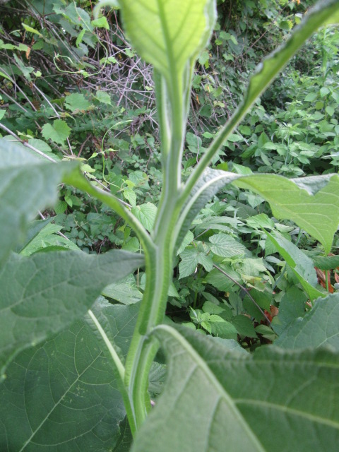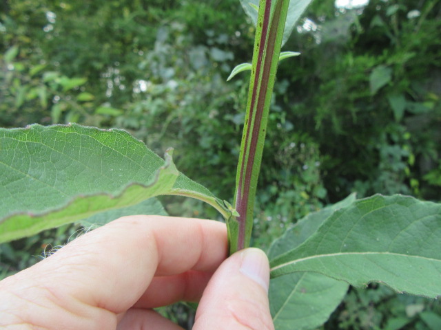 Verbesina virginica is a perennial wildflower that can grow to a height of at least 6-7’ tall. The stems are densely pubescent with very short curved hairs giving them a felty texture. Of course, they have fleshy longitudinal wings. Younger stems are green with creamy-green streaks, while the stems on older plants are green with maroon streaks.