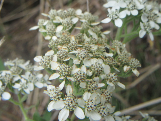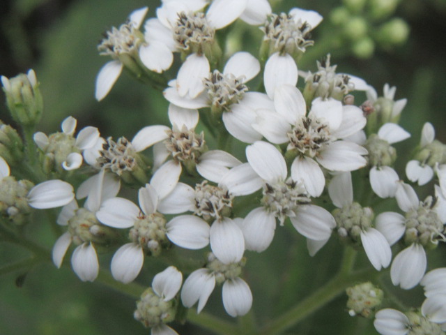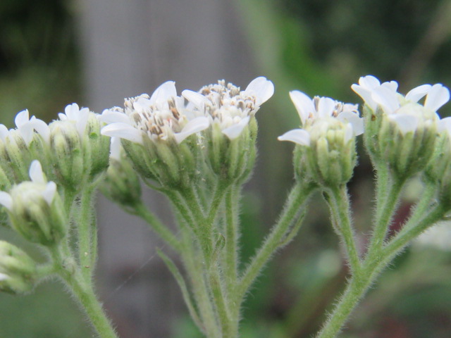 The stems terminate in panicles of 40-200 flower heads with 2-4 flower heads per cluster 1-1 1/2” across. The heads are subtended by 8-13 involucral bracts.