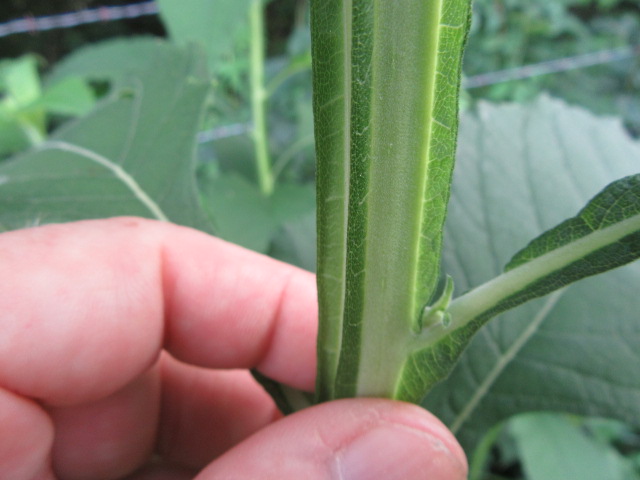 The above photo was taken on July 17 in 2021. As you can see, the stems are a creamy green and the wings are green… You can also see how the right margin of the leaf on the left is an extension of the wing of the stem below the leaf. The left margin of the leaf on the right) is attached to the wing on the stem going upward. Hmmm…