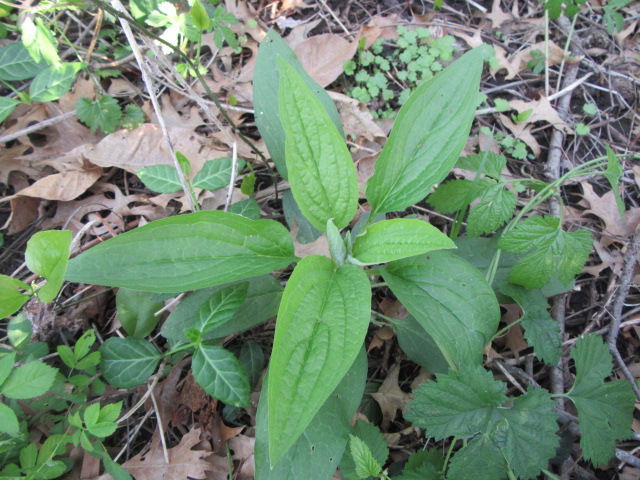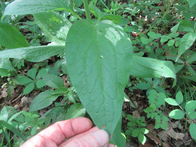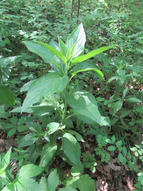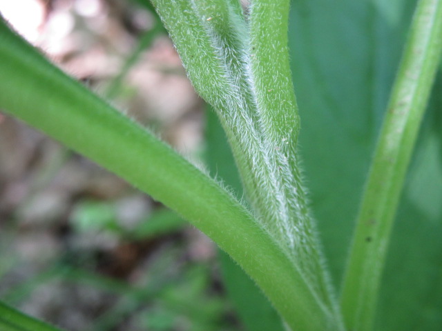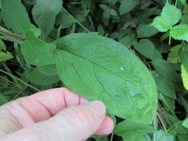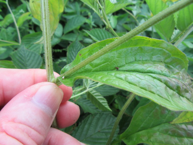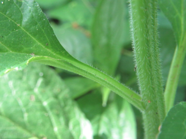 Basal and lower stem leaves grow up to 6” long x 3 1/2” wide and are described as being elliptic or ovate in shape and have long petioles (leaf stems), the basal leaves are absent or dying when the plants start to flower. The lower and upper leaves grow in an alternate pattern along the stems, getting progressively narrower toward the top of the stems. Lower leaves have long petioles (leaf stems), while upper leaves are usually sessile (no petioles). Stem leaves have short, winged petioles where side branches emerge from the leaf axil. The upper leaf surface is kind of rough, with fine pustular-based hairs (emerging from blister-like swellings).