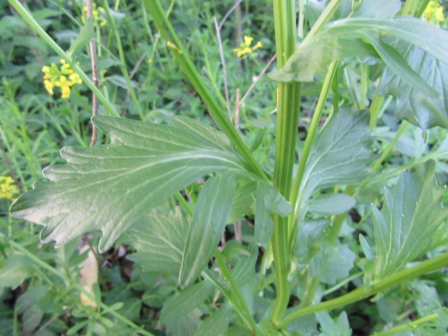 Basal and lower stem leaves are pinnately divided (lyrate-pinnatifid) with up to 4 pairs of lobes that are oval or obovate that encircle (clasp) the long petioles (leaf stems) with a much larger terminal lobe. They are a shiny dark green, hairless (glabrous), with wavy margins that sometimes have blunt teeth.