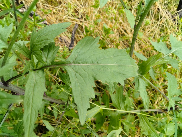 The leaves grow in an alternate pattern along the stems. The pinnately-lobed leaves grow up to 8” long and 2” across and are divided into 3-11 lobes. The lobes themselves are toothed to irregularly lobed. The leaves are densely covered with very short hairs, upper leaves are nearly glabrous (not hairy). In outline, the leaves are lance-shaped (lanceolate) to lanceolate-triangular. The upper leaves are smaller, sessile (no petioles), or nearly so, and have 3-5 lobes.