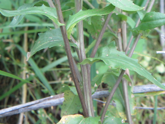 Plants grow to around 2 1/2’ tall with glabrous (not hairy), ribbed stems, and branch out just below the inflorescence. Some of the ribs along the stem may be winged. Seeds that germinate during the summer and fall will produce a rosette of leaves that apparently grow over the winter and produce flowering stems the following spring.