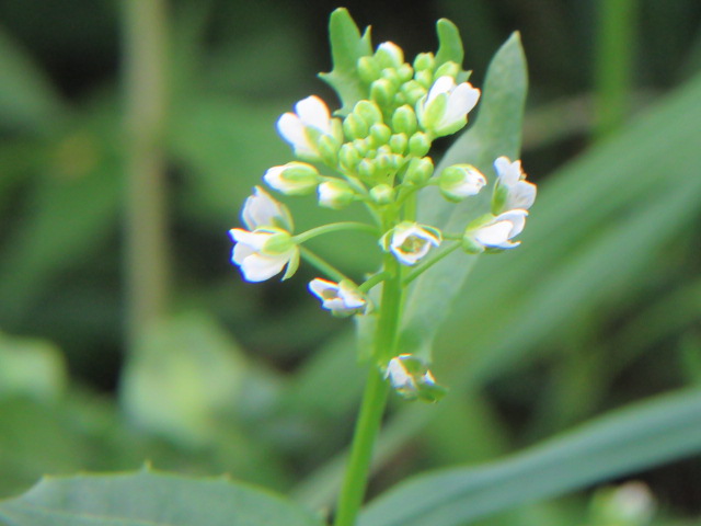 The flowers have 4 white petals with a claw-like base and are surrounded by 4 sepals. Each flower, approximately 1/8” wide when fully open, is attached by a short peduncle (flower stem) that curves upward.