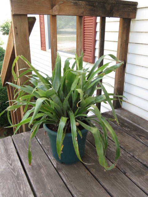 I sold the mansion in Mississippi to a group who remodeled the mansion and turned it into a nice bed and breakfast (The Thompson House Bed and Breakfast). Dad asked me to move back to the family farm in mid-Missouri, so I did. I left Mississippi and moved back in February 2013, I gave up hundreds of plants but took most of the succulents, Alocasia and some of my other favorites, including the Billbergia nutans. Amazingly, they survived an 8-9 hour trip in 30-degree temperatures in the back of a trailer. When temps started warming up in the spring, I had to figure out where to put the plants. I put this plant along the wall between the back porch and the basement steps where it received morning sun.
