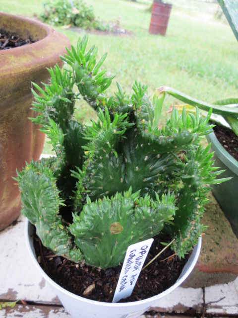 I brought my Austrocylindropuntia subulata f. cristata (Crested Eve’s Needle) home from Lowe’s in Greenville, Mississippi on 8-25-12 when I was living in Leland. I liked the way it was growing in kind of a circular shape and has small leaves on top. The label said it was an Opuntia subulata cristata.