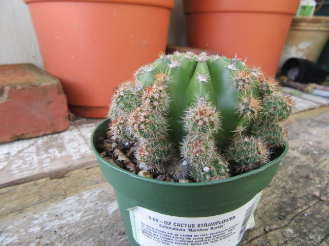 I bought this Echinobivia ‘Rainbow Bursts’ from Walmart on 2-1-16. The label said: ”Rainbow Bursts are so named for their spectacular display of colorful flowers during the spring and summer. These hybrids are cross (combined genetics) of Echinopsis species and Lobivia species, hence the name Echinobivia. Protect from frost.” The plant was growing in a 2 1/2” (4 oz.) pot. It measured approximately 2 1/4” tall x 3 1/2” wide.