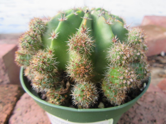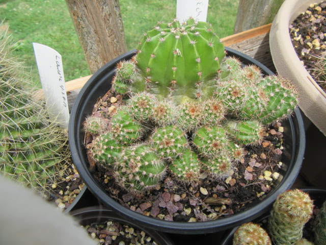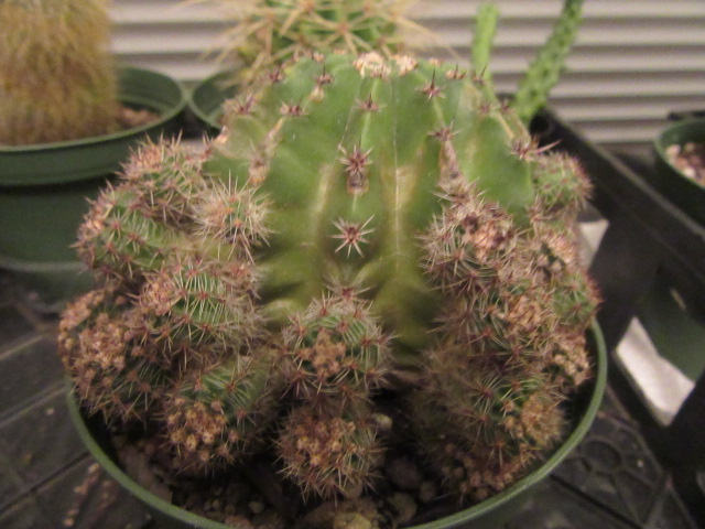 Well, the cluster of Echinopsis ‘Rainbow Bursts’ keeps getting bigger. I had to move the plants inside for the winter on October 15 because an “F” was in the forecast. The group measured 4″ tall x 7″ wide and they are doing well.