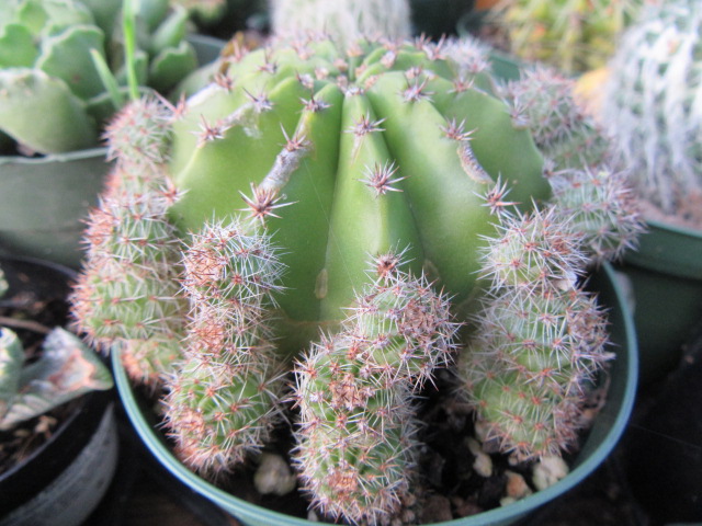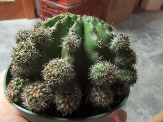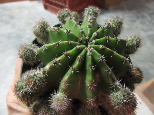 It was at least 4 inches tall when my mother was given it by a neighbour, and then she had it as mentioned until about 1983 or so, when she gave me one of her specimens. I have kept it on a closed balcony ever since, but have never seen it flower. It is now about 7 inches, and have lots of “babies” at the base and higher up on the stem. Mine has 12 ribs (mother plant), and 10-11 on the babies. Short spines, whitish and wooly at the apex.