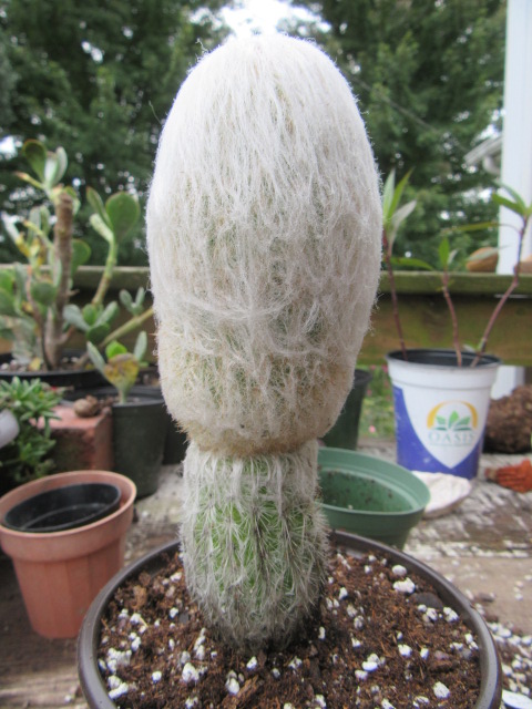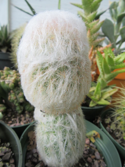 Under all that hair is a columnar cactus with numerous areoles with around 30 short radial spines each! While it may look soft to the touch, there are also many very thin central spines so you still need to handle them with care. If you noticed in the first photo, the upper of this cactus was like a little tuft of hair when I first brought it home