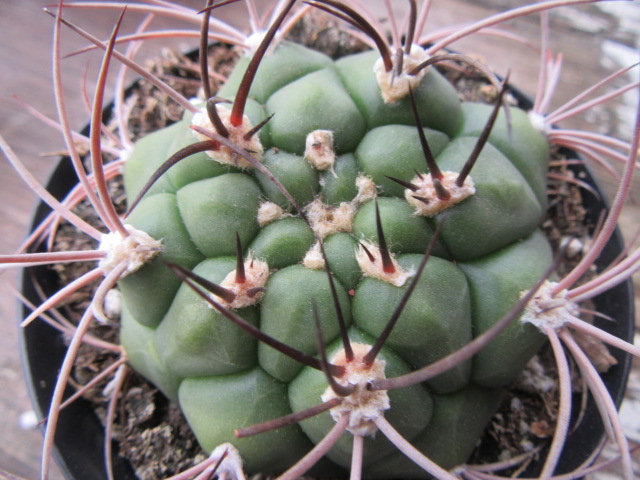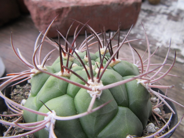 Since this plant is small, it has 1-3 nearly straight central spines depending on where you look, and 7-8 recurved radial spines. Llifle says the species has 1-3 central spines and 10-15 radial spines. The felted areoles sit on top of strangely large and globose-looking tubercles. The subspecies Gymnocalycium saglionis subsp. tilcarense has longer spines and larger tubercles than the species. I haven’t seen the species in person, but my plant appears to have large tubercles and fairly long spines. So, it could possibly be the subspecies.